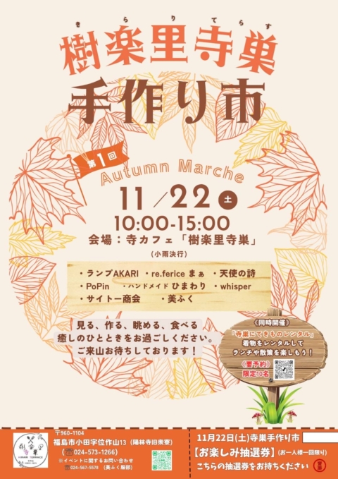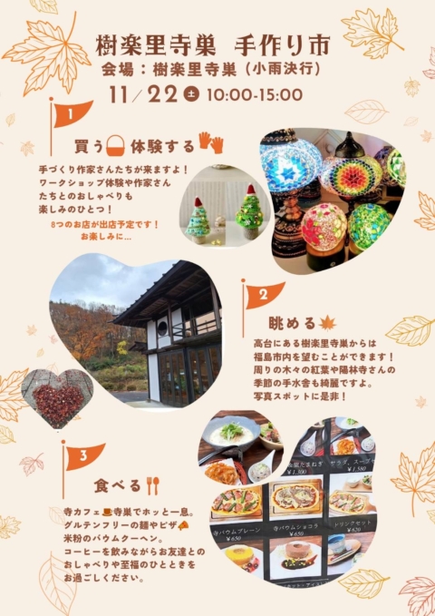 寺カフェ樹楽里寺巣では【手作り市】を開催します。